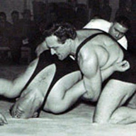 If there's an PEPLUM actor that should have had a bigger career it's Umberto Silvestri. Umberto was a championship wrestler (last photo) and began his career in movies playing big guys who, well, wrestle. Because his film career started in the early 1940s and peaked in the early 1950s, he missed out on most of the PEPLUM explosion of the late 1950s and 1960s. The highlight of his career was wrestling with Kirk Douglas in ULYSSES, as seen in the top two images.